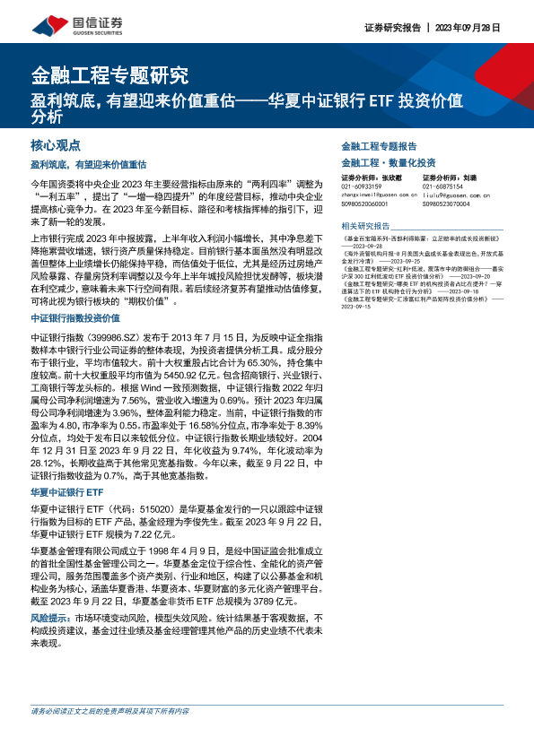 【国信证券】【20230928】金融工程专题研究:华夏中证银行ETF投资价值分析,盈利筑底,有望迎来价值重估-18页