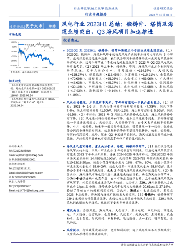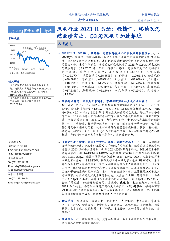 【海通证券】【20231001】风电行业2023H1总结:锻铸件、塔筒及海缆业绩突出,Q3海风项目加速推进-21页