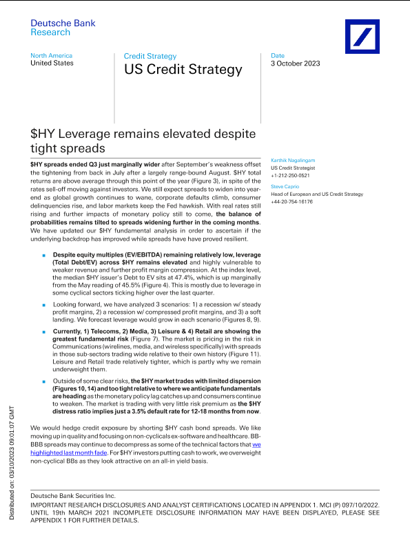 【Deutsche Bank Research】【20231003】US Credit Strategy $HY Leverage remains elevated despite tight spreads-15页
