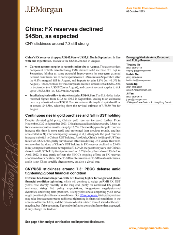 【J.P. Morgan】【20231008】China's FX reserves declined $45bn, as expected CNY stickiness around 7.3-8页