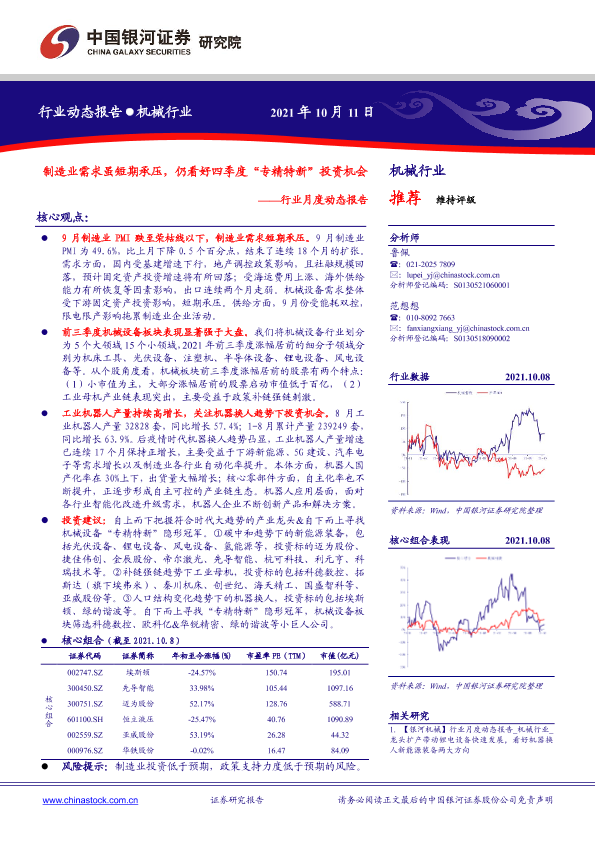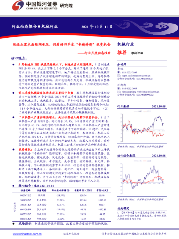 【银河证券】【20211011】机械行业月度动态报告:制造业需求虽短期承压,仍看好四季度“专精特新”投资机会-30页
