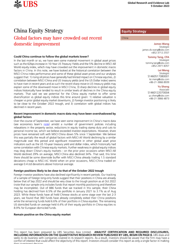 【UBS Securities Asia Limited】【20231005】es-China Equity Strategy Global factors may have crowded out recent domestic improvement-12页