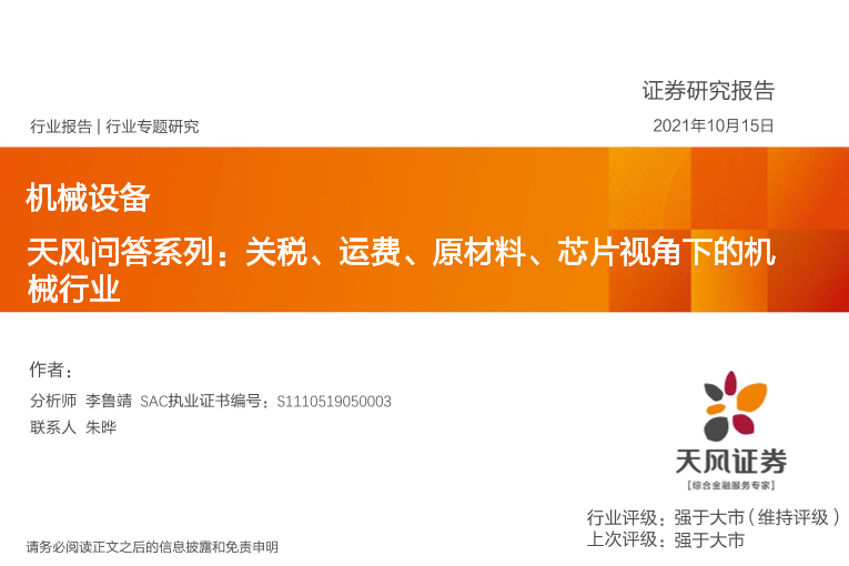 【天风证券】【20211015】机械设备行业天风问答系列:关税、运费、原材料、芯片视角下的机械行业-48页
