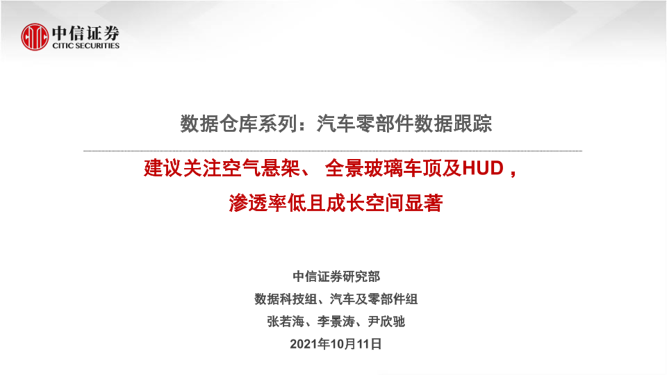 【中信证券】【20211011】汽车及零部件行业数据仓库系列:汽车零部件数据跟踪,建议关注空气悬架、全景玻璃车顶及HUD,渗透率低且成长空间显著-22页