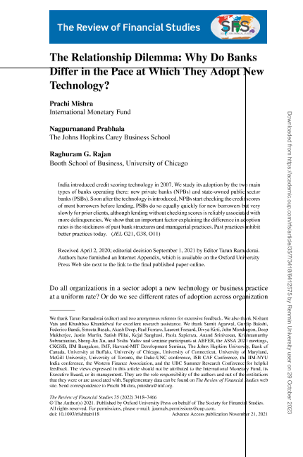 【Prachi Mishra&Nagpurnanand Prabhala&Raghuram G. Rajan】【20210901】RFS-关系困境:为什么银行在采用新技术的速度上有所不同?-49页