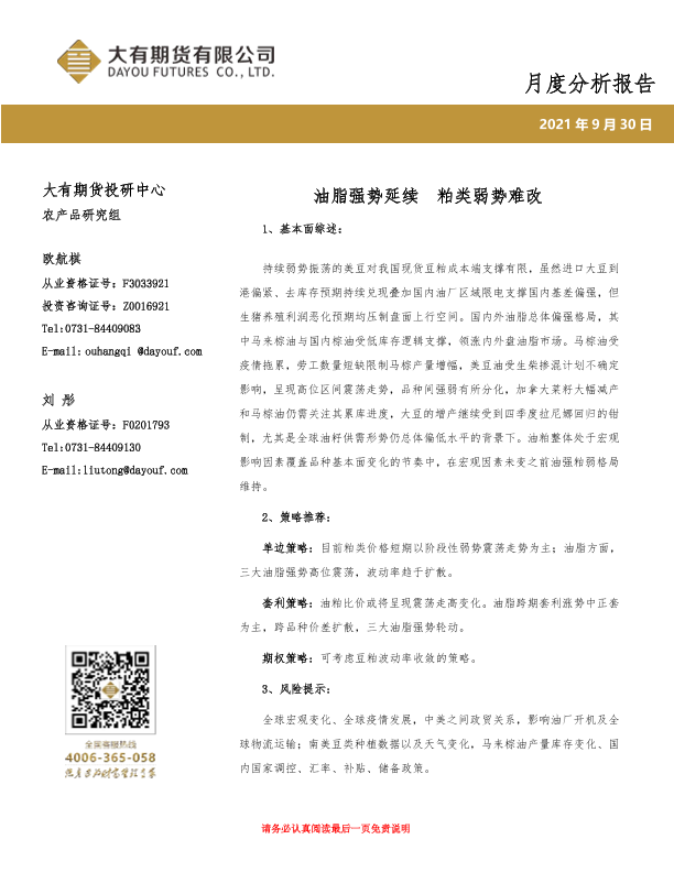 【大有期货】【20210930】油脂油料产业链月度分析报告:油脂强势延续,粕类弱势难改-16页