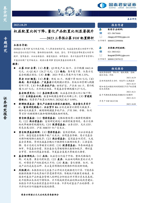 【国泰君安证券】【20231029】2023三季报公募FOF配置解析:权益配置比例下降,量化产品配置比例显著提升-33页