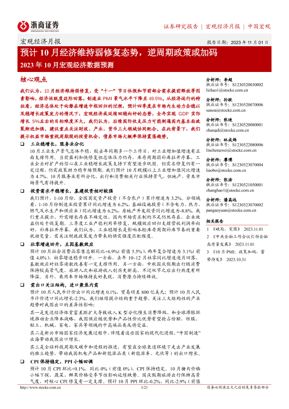 【浙商证券】【20231101】2023年10月宏观经济数据预测:预计10月经济维持弱修复态势,逆周期政策或加码-21页