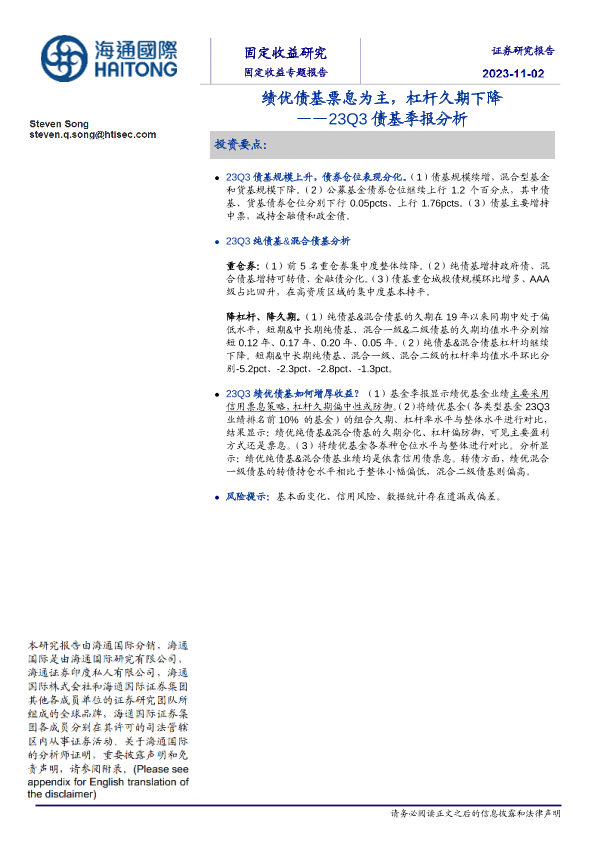 【海通国际】【20231102】23Q3债基季报分析:绩优债基票息为主,杠杆久期下降-21页
