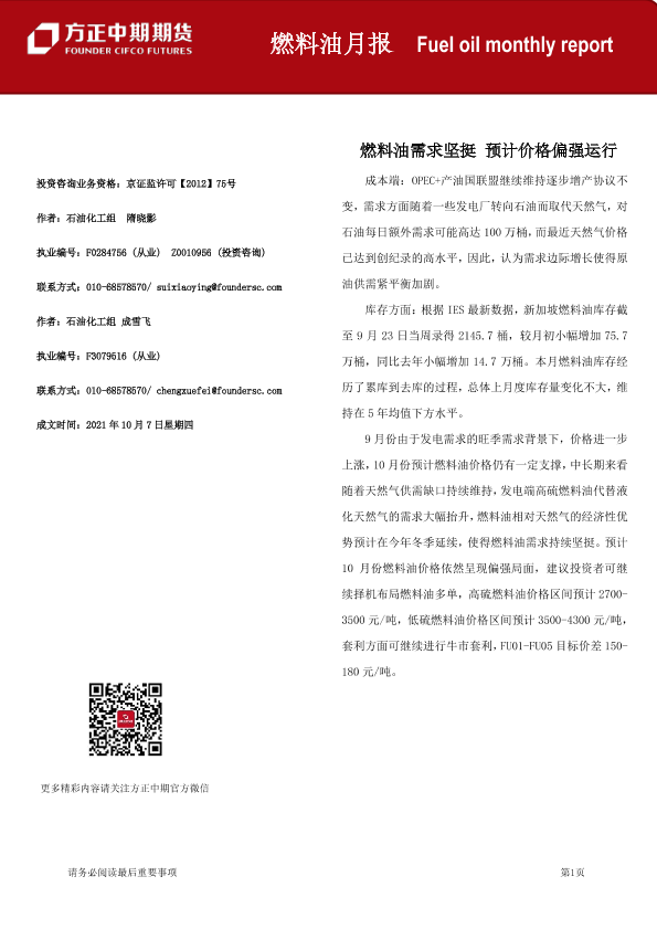 【方正中期期货】【20211007】燃料油月报:燃料油需求坚挺,预计价格偏强运行-17页