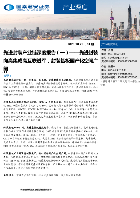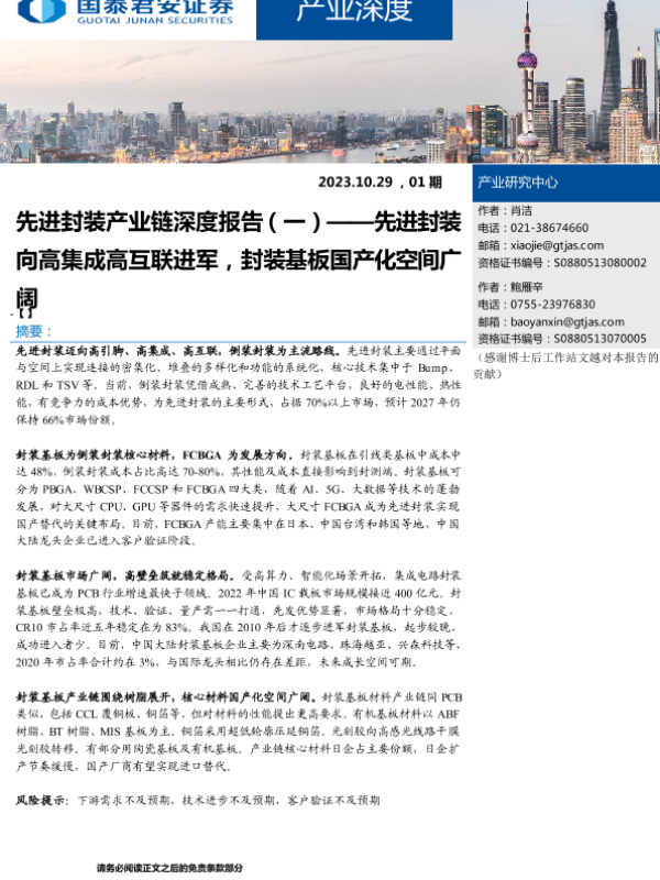 【国泰君安证券】【20231029】产业深度01期:先进封装产业链深度报告(一),先进封装向高集成高互联进军,封装基板国产化空间广阔-21页