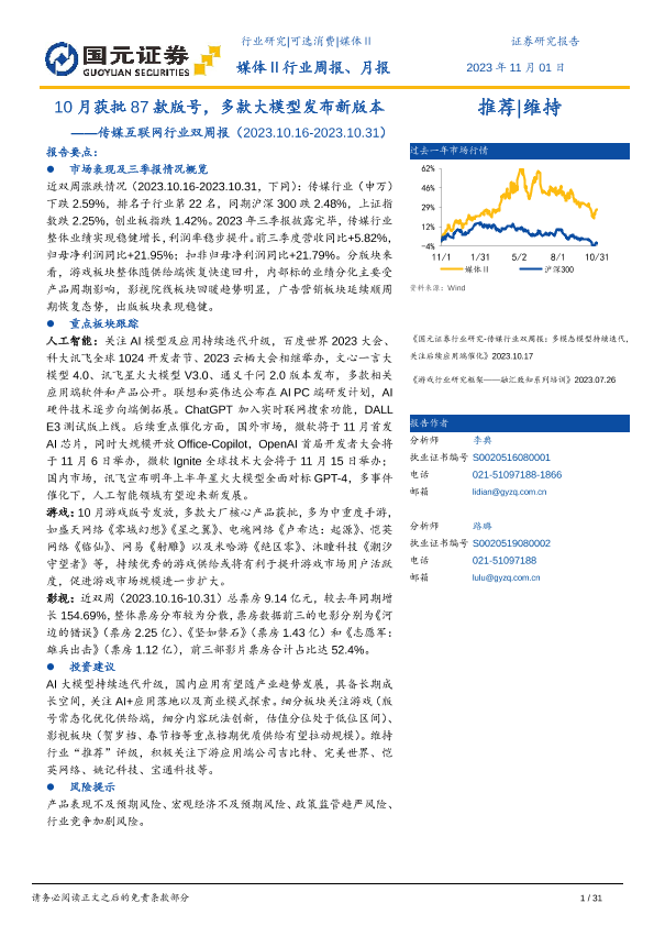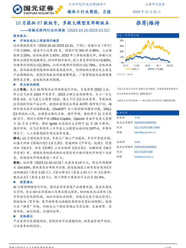 【国元证券】【20231101】传媒互联网行业双周报:10月获批87款版号,多款大模型发布新版本-31页