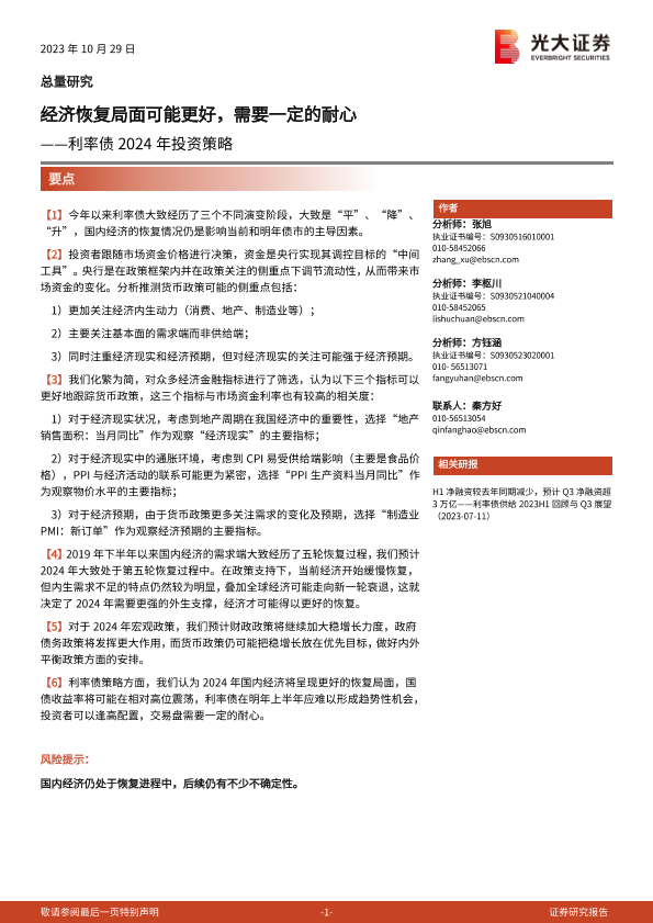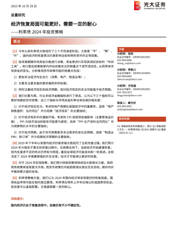 【光大证券】【20231029】利率债2024年投资策略:经济恢复局面可能更好,需要一定的耐心-23页