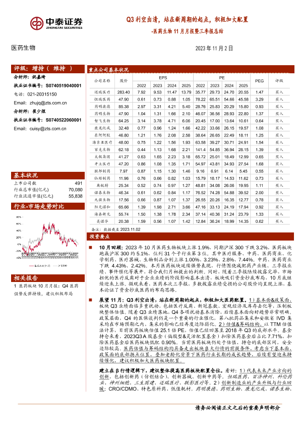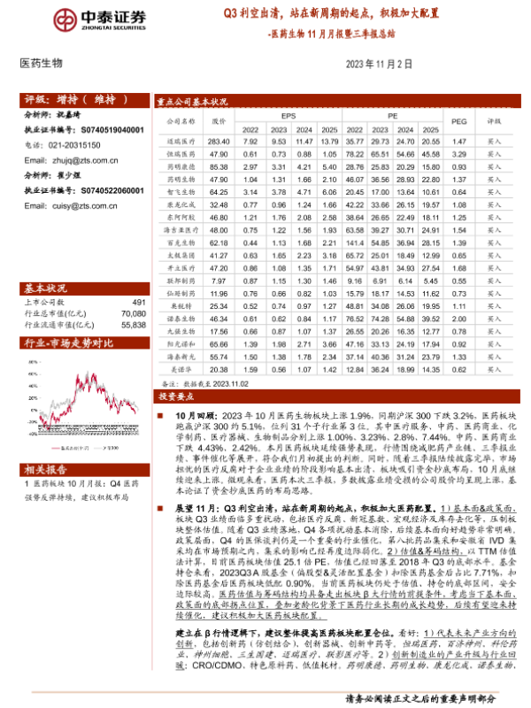 【中泰证券】【20231102】医药生物行业11月月报暨三季报总结:Q3利空出清,站在新周期的起点,积极加大配置-24页