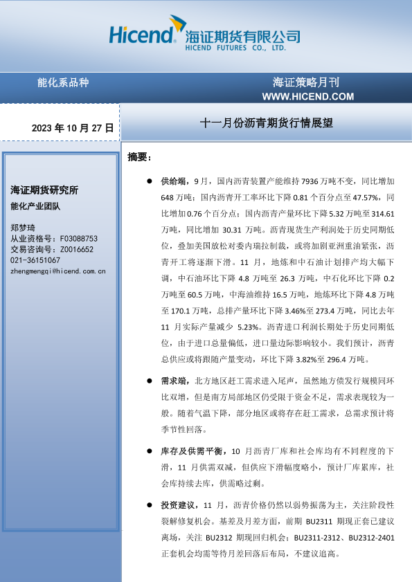 【海证期货】【20231027】十一月份沥青期货行情展望-23页