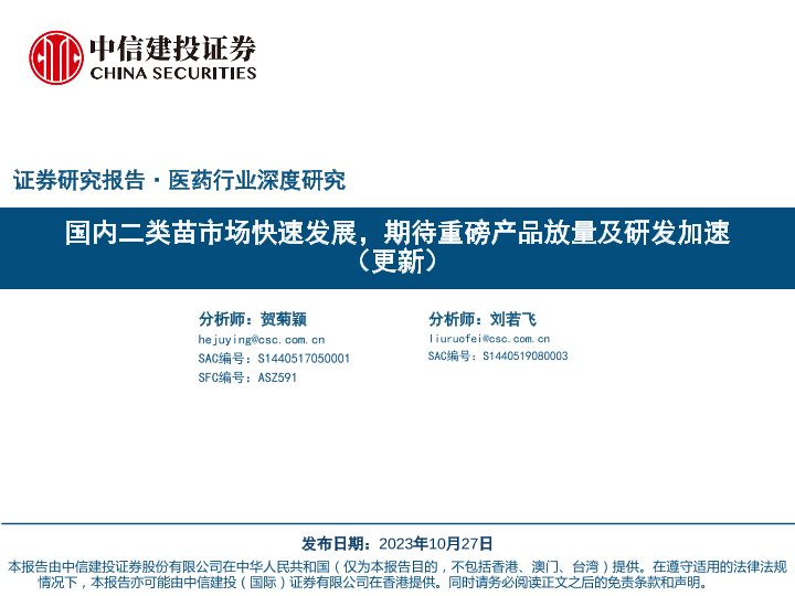 【中信建投证券】【20231027】医药行业深度研究:国内二类苗市场快速发展,期待重磅产品放量及研发加速-69页