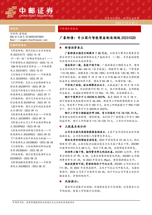 【中邮证券】【20231020】可转债打新报告:广泰转债,专注国内智能装备制造领域-15页