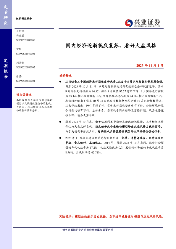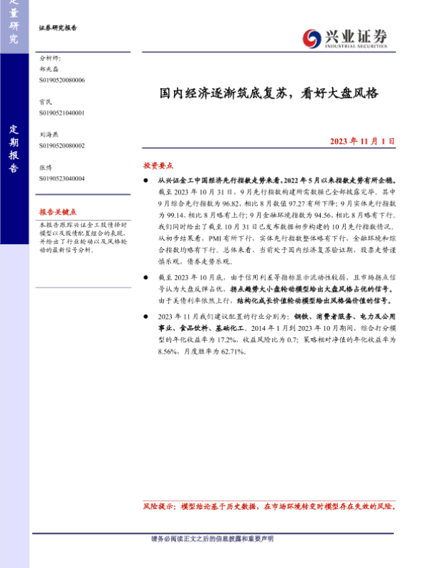【兴业证券】【20231101】国内经济逐渐筑底复苏,看好大盘风格-26页