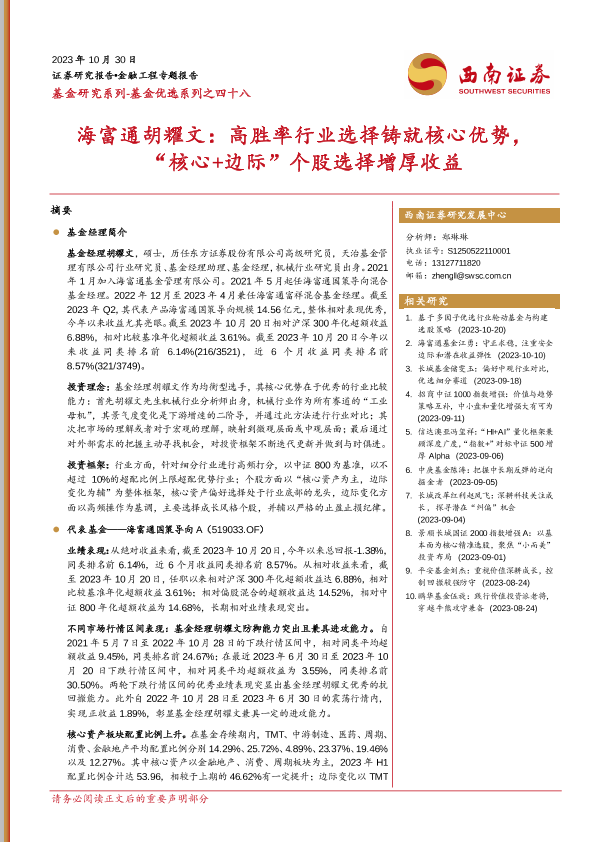 【西南证券】【20231030】基金研究系列_基金优选系列之四十八:海富通胡耀文,高胜率行业选择铸就核心优势,“核心+边际”个股选择增厚收益-27页