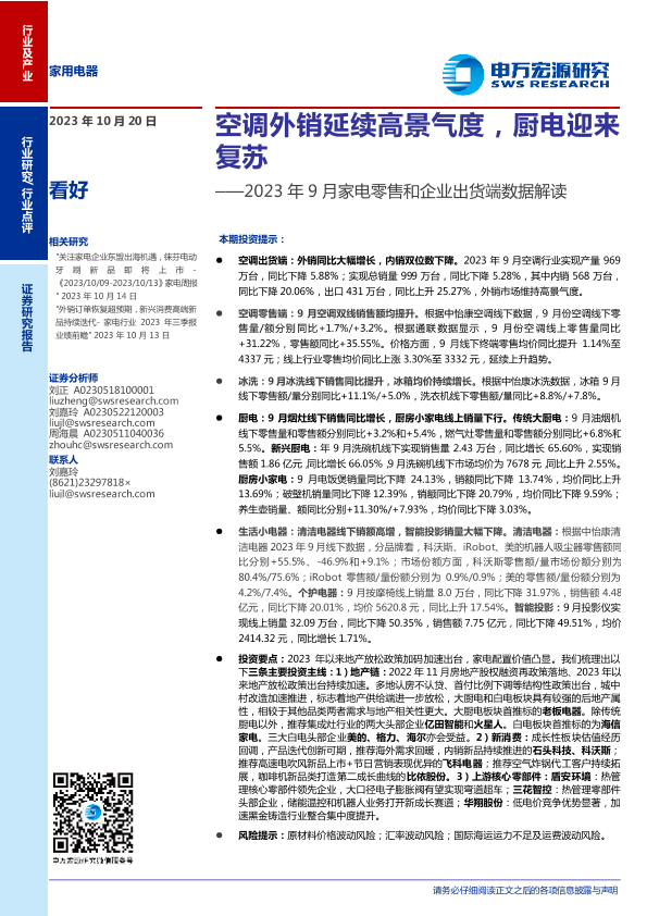 【申万宏源】【20231020】家用电器行业2023年9月家电零售和企业出货端数据解读:空调外销延续高景气度,厨电迎来复苏-18页