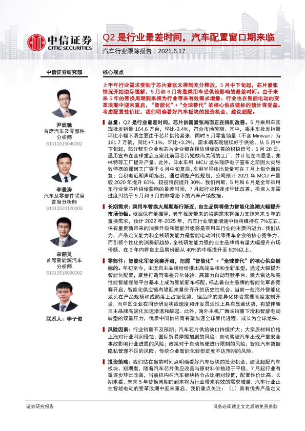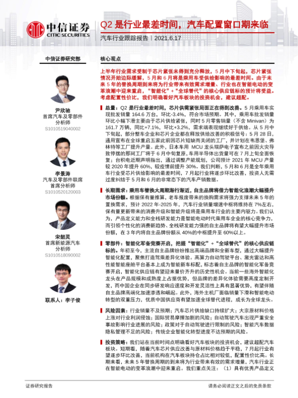 【中信证券】【20210617】汽车行业跟踪报告:Q2是行业最差时间,汽车配置窗口期来临-23页