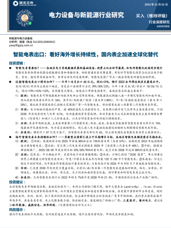 【国金证券】【20231101】电力设备与新能源行业研究智能电表出口:看好海外增长持续性,国内表企加速全球化替代-26页