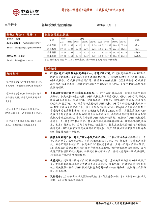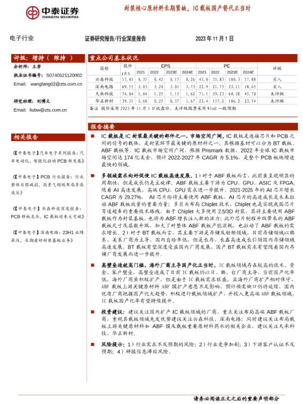 【中泰证券】【20231101】电子行业:封装核心原材料长期紧缺,IC载板国产替代正当时-27页