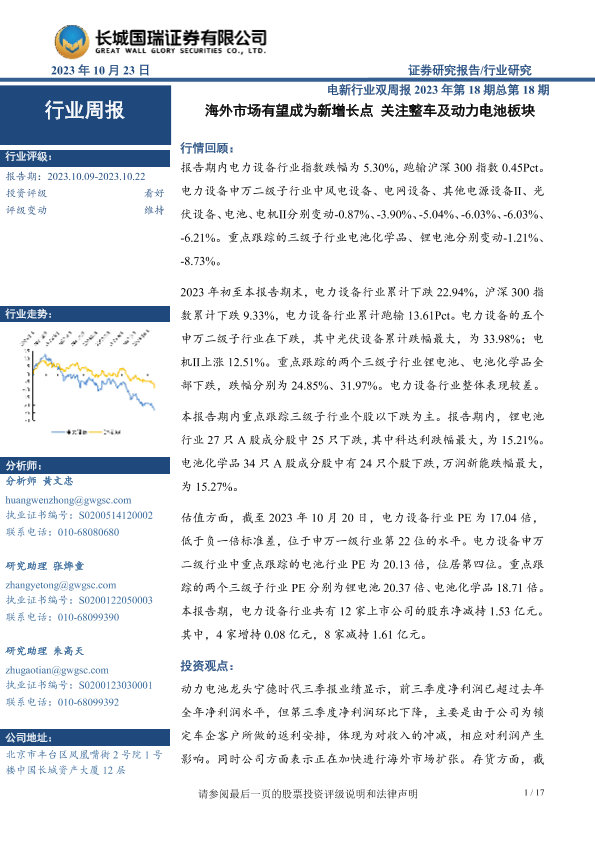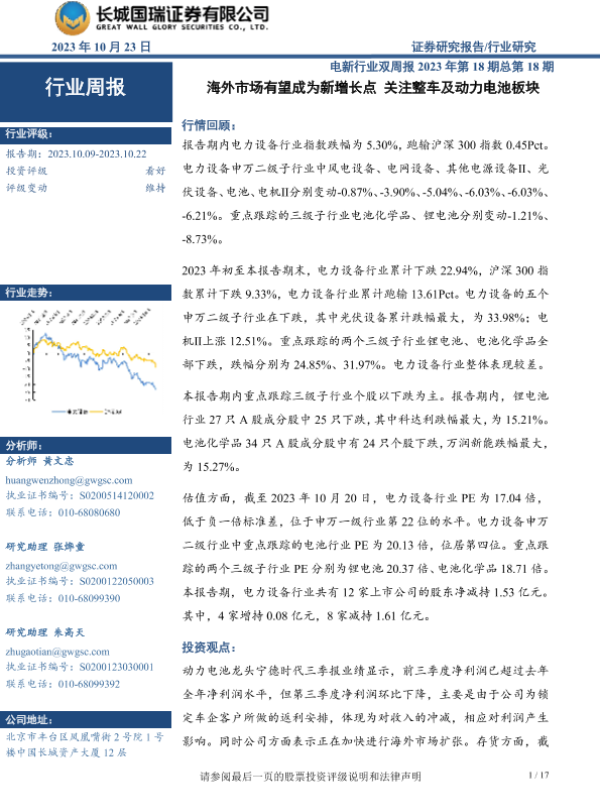 【长城国瑞证券】【20231023】电新行业双周报2023年第18期总第18期:海外市场有望成为新增长点,关注整车及动力电池板块-17页
