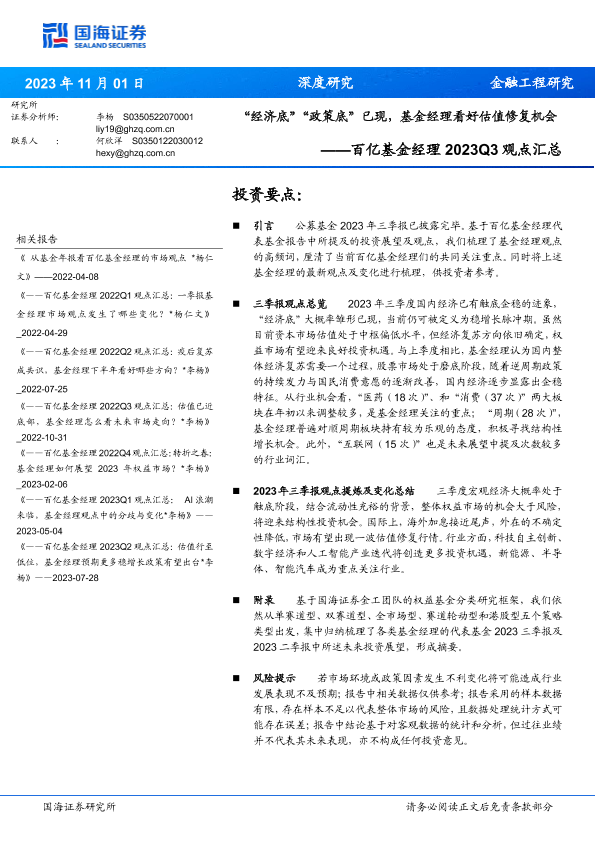 【国海证券】【20231101】百亿基金经理2023Q3观点汇总:“经济底”“政策底”已现,基金经理看好估值修复机会-34页