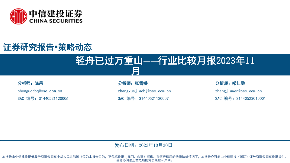 【中信建投证券】【20231030】行业比较月报2023年11月:轻舟已过万重山-39页