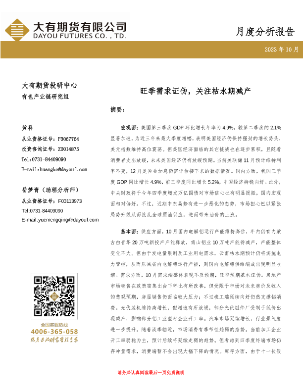 【大有期货】【20231031】铝月度分析报告:旺季需求证伪,关注枯水期减产-20页