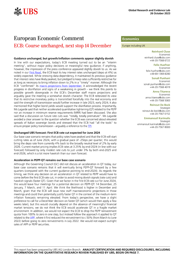 【UBS AG London Branch】【20231026】ECB Course unchanged, next stop 14 December-10页