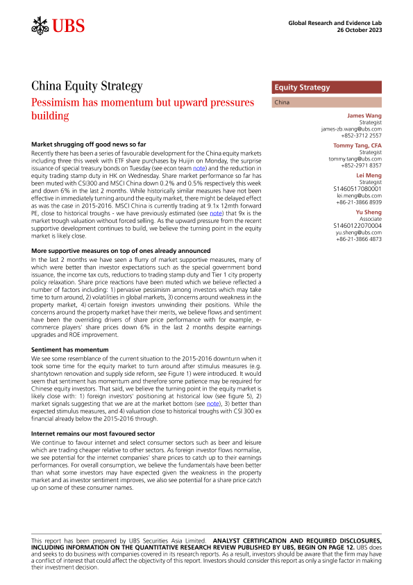 【UBS Securities Asia Limited】【20231026】es-China Equity Strategy _Pessimism has momentum but upward pressures building-16页