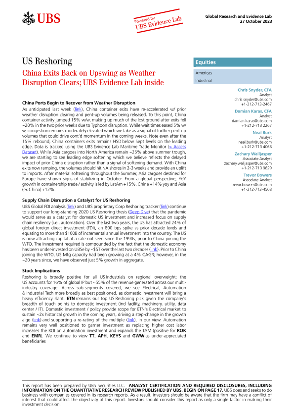 【UBS】【20231027】US Reshoring _China Exits Back on Upswing as Weather Disruption Clears-26页