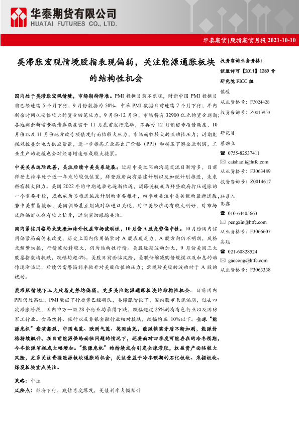【华泰期货】【20211010】股指期货月报:类滞胀宏观情境股指表现偏弱,关注能源通胀板块的结构性机会-20页