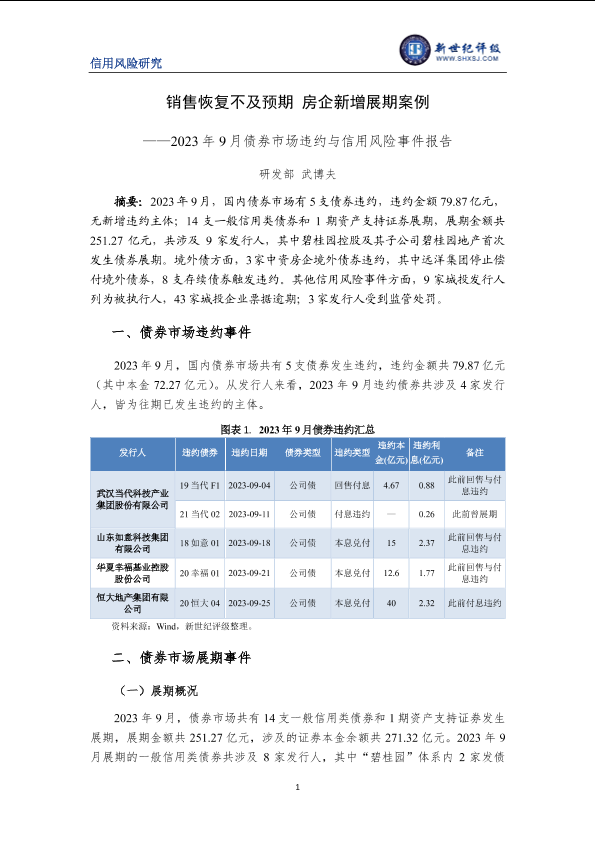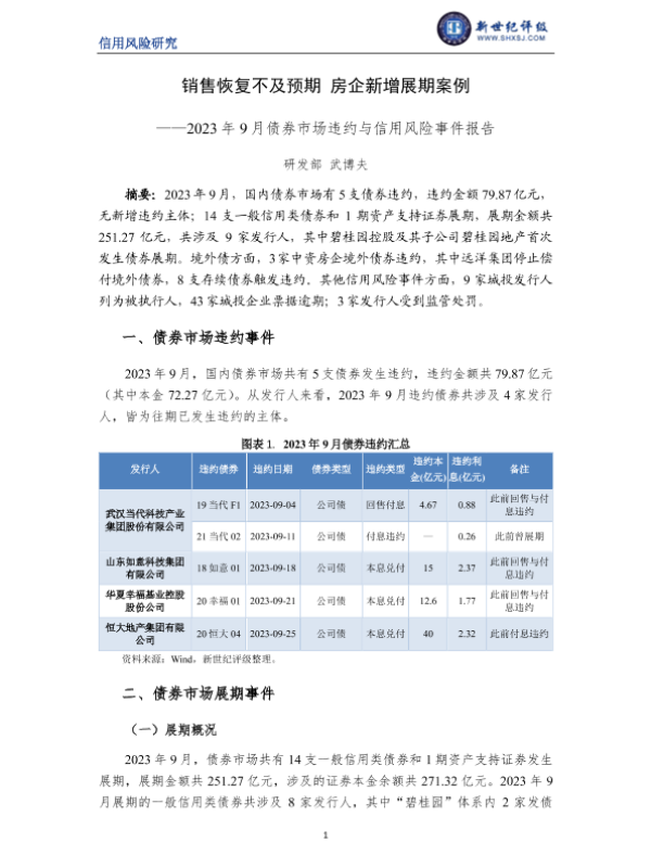 【新世纪评级】【20230901】销售恢复不及预期 房企新增展期案例——2023年9月债券市场违约与信用风险事件报告-10页