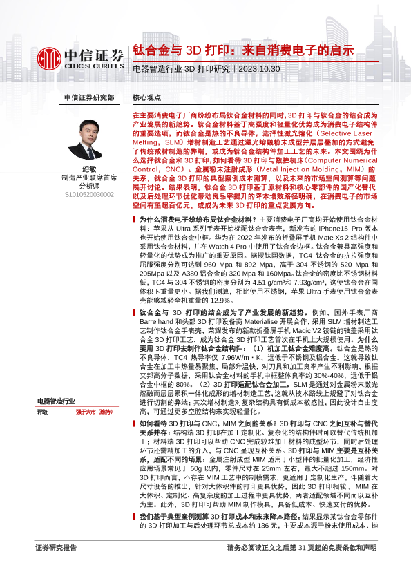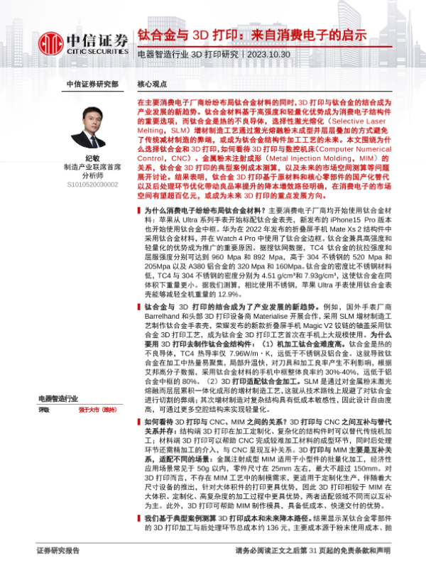 【中信证券】【20231030】电器智造行业证券研究报告:钛合金与3D打印,来自消费电子的启示-31页