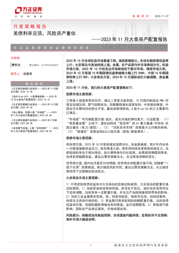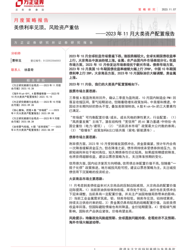 【方正证券】【20231107】2023年11月大类资产配置报告:美债利率见顶,风险资产重估-23页