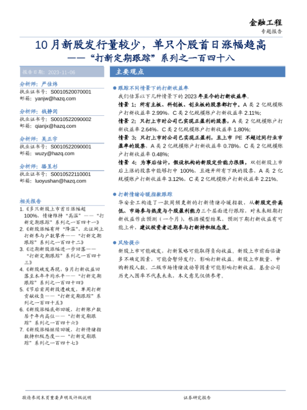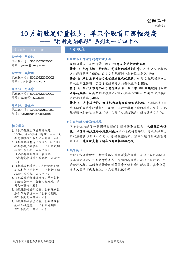【华安证券】【20231106】“打新定期跟踪”系列之一百四十八:10月新股发行量较少,单只个股首日涨幅趋高-20页