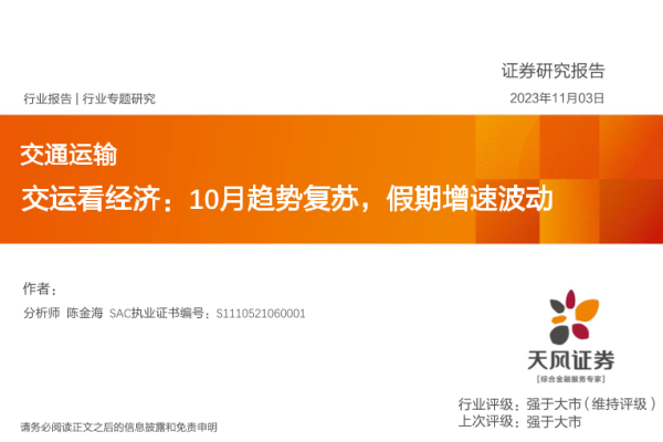 【天风证券】【20231103】交通运输行业专题研究:交运看经济,10月趋势复苏,假期增速波动-21页