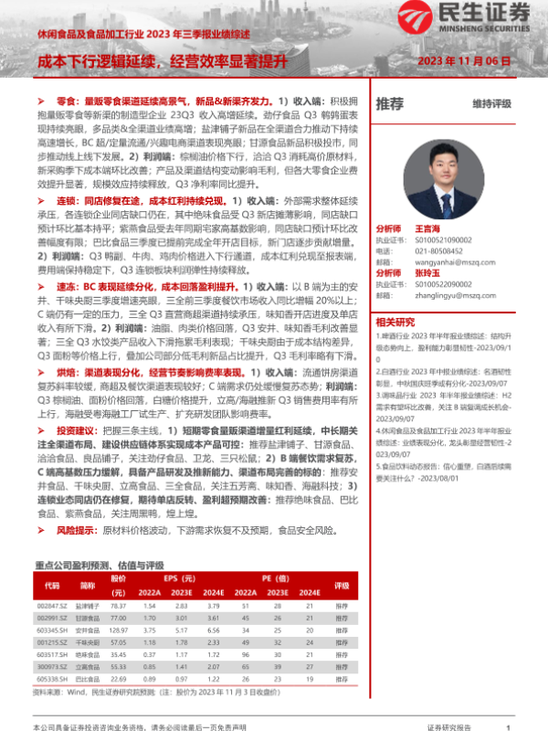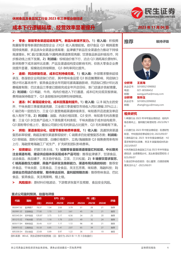 【民生证券】【20231106】休闲食品及食品加工行业2023年三季报业绩综述:成本下行逻辑延续,经营效率显著提升-28页