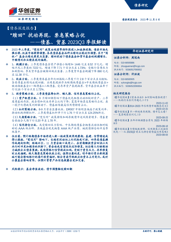 【华创证券】【20231108】债基、货基2023Q3季报解读:“赎回”扰动再现,票息策略占优-30页