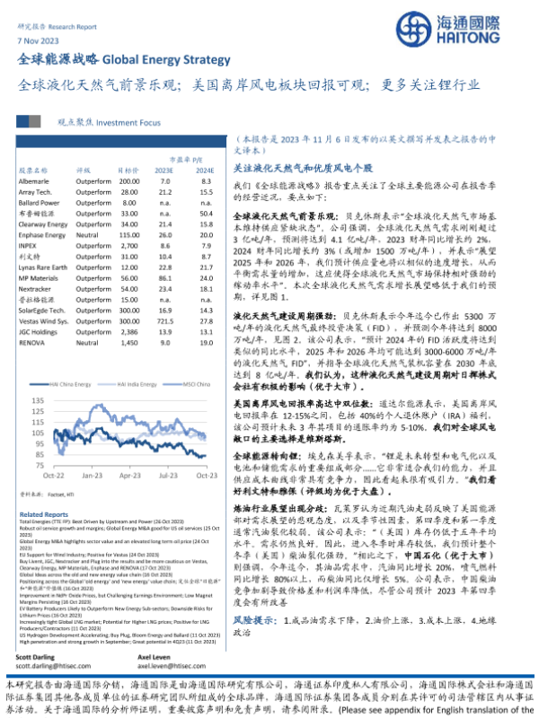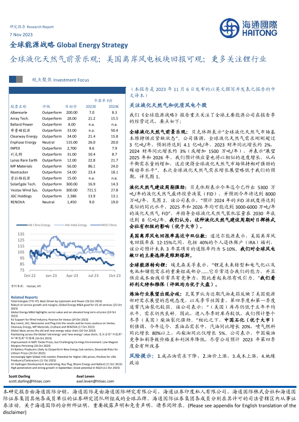 【海通国际】【20231107】全球能源行业战略:全球液化天然气前景乐观;美国离岸风电板块回报可观;更多关注锂行业-43页