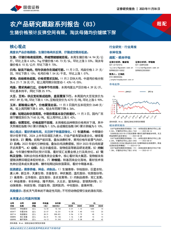 【国信证券】【20231105】农林牧渔行业农产品研究跟踪系列报告(83):生猪价格预计反弹空间有限,淘汰母猪均价继续下探-26页