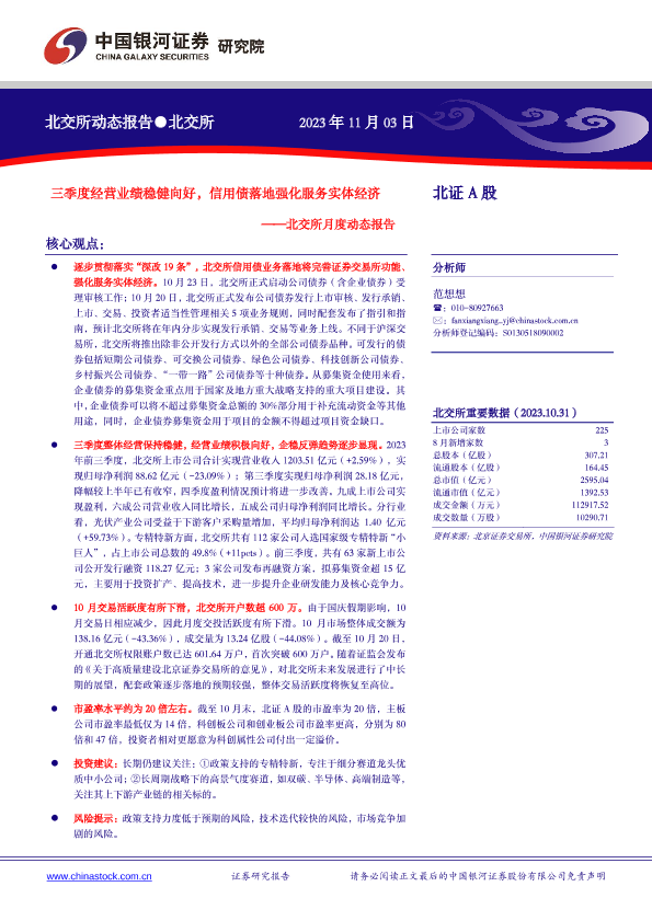 【银河证券】【20231103】北交所月度动态报告:三季度经营业绩稳健向好,信用债落地强化服务实体经济-23页