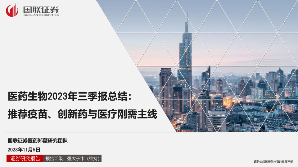 【国联证券】【20231105】医药生物行业2023年三季报总结:推荐疫苗、创新药与医疗刚需主线-46页