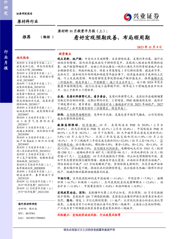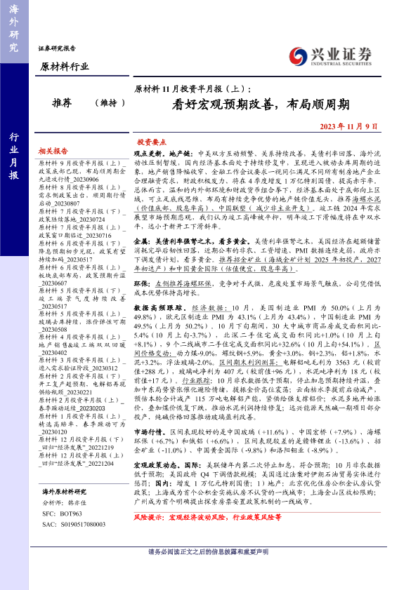 【兴业证券】【20231109】原材料行业11月投资半月报(上):看好宏观预期改善,布局顺周期-22页