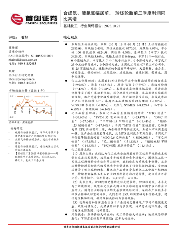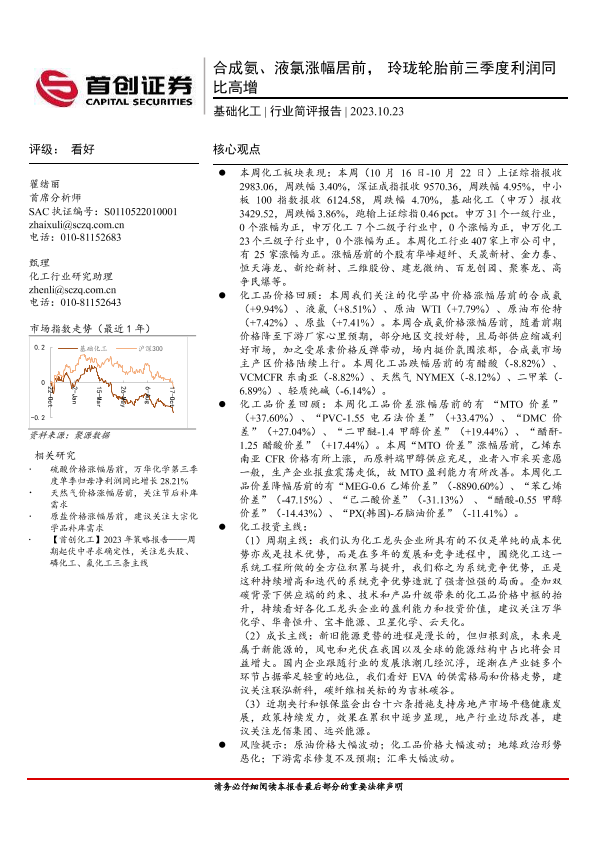 【首创证券】【20231023】基础化工行业简评报告:合成氨、液氯涨幅居前,玲珑轮胎前三季度利润同比高增-19页