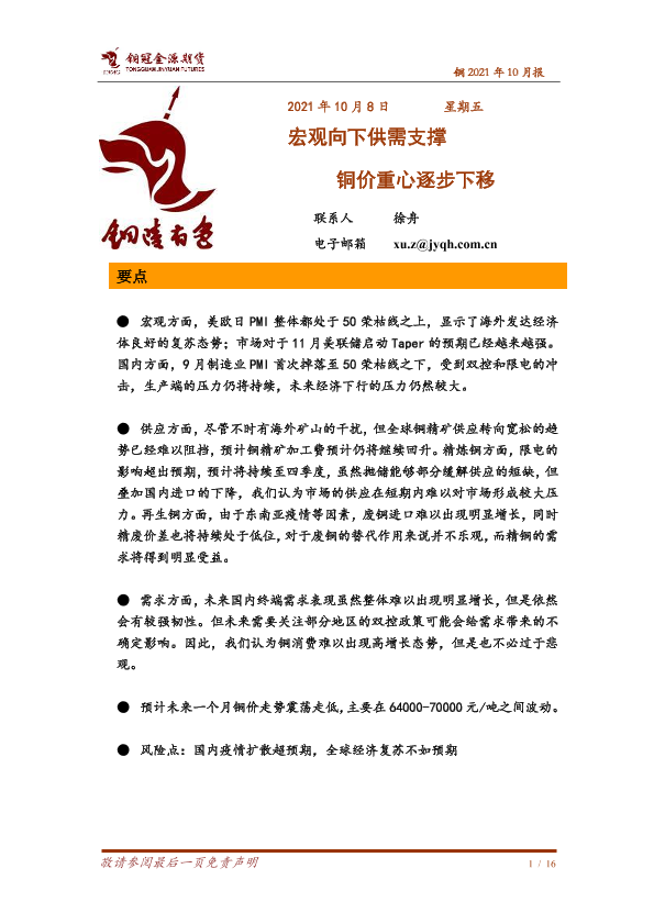 【铜冠金源期货】【20211008】铜2021年10月报:宏观向下供需支撑,铜价重心逐步下移-16页