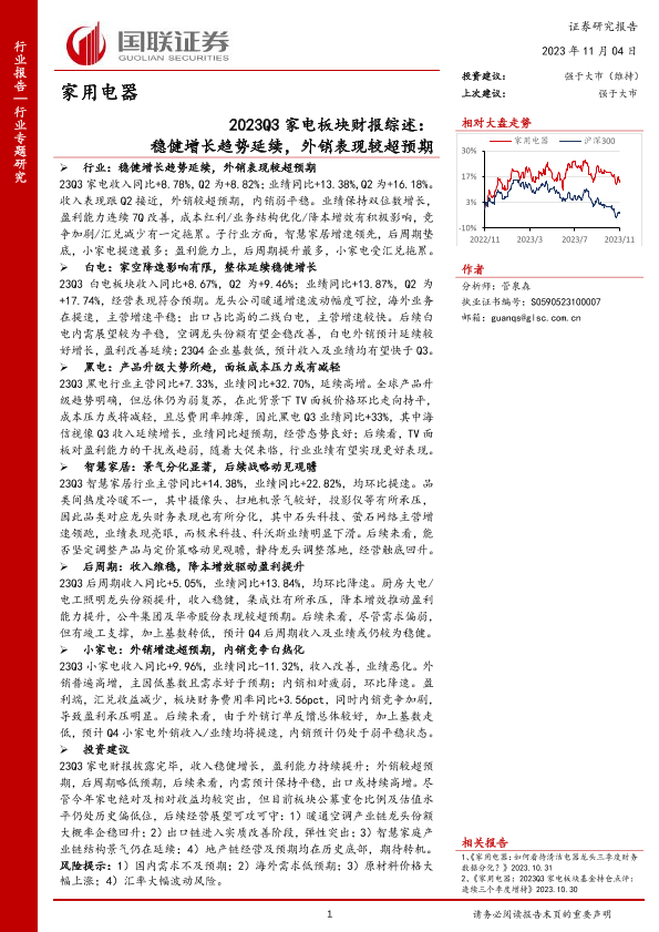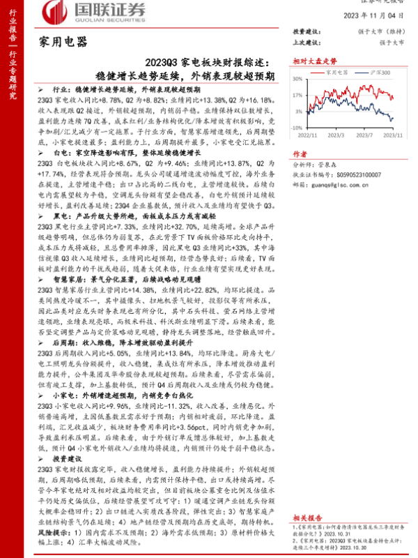 【国联证券】【20231104】家用电器行业2023Q3家电板块财报综述:稳健增长趋势延续,外销表现较超预期-27页